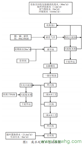 設(shè)備及設(shè)備及回收包裝桶清洗廢水(90m3/d)、地坪沖洗廢水(1.2m3/d)、尾氣吸收水(9m3/d)、冷凝廢水(0.64m3/d),經(jīng)收集池1收集后泵送至破乳氣浮設(shè)備。收集池設(shè)提籃式過濾器,用于浮渣等的收集。破乳氣浮階段首先加酸或堿調(diào)節(jié)pH到弱堿性后,依次加入破乳劑、混凝劑PAC、助凝劑PAM后進(jìn)行氣浮反應(yīng),氣浮反應(yīng)出水自流進(jìn)入調(diào)節(jié)池。初期雨水直接進(jìn)入調(diào)節(jié)池。為了調(diào)配后續(xù)的水質(zhì),在調(diào)節(jié)池末端加入營養(yǎng)劑。