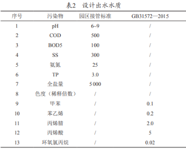 處理后的水質(zhì)達(dá)到當(dāng)?shù)貓@區(qū)接管標(biāo)準(zhǔn),并且滿足行業(yè)間接排放標(biāo)準(zhǔn)《合成樹脂工業(yè)污染物排放標(biāo)準(zhǔn)》(GB31572—2015),見表2。