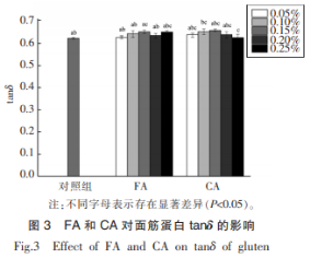 損耗角正切值tanδ為G''與的G'比值。tanδ可以反映物料的黏彈性特征,體現(xiàn)樣品的理化性質(zhì)接近于固體還是液體,當(dāng)tanδ<1時表示樣品的品質(zhì)接近于固體,而當(dāng)tanδ>1則表示樣品的性質(zhì)近似流體。tanδ的變化可以表現(xiàn)出樣品聚合度的變化,當(dāng)tanδ降低時,表示樣品聚合度增大,反之樣品的聚合度減小。如圖3所示,本試驗所有試驗組的彈性模量(G')均大于黏性模量(G''),即面筋蛋白的tanδ均小于1,說明面筋蛋白具有類似固體的性質(zhì),與Khatkar等的試驗結(jié)果相同。而相比于對照組,F(xiàn)A和CA的添加對于面筋蛋白的tanδ無明顯影響。