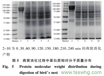 燕窩經(jīng)過燉煮消化后,蛋白質(zhì)溶解度僅為47%,仍有50%以上的蛋白質(zhì)未溶解,推測其溶解性與蛋白質(zhì)二級結(jié)構(gòu)有關(guān)。蛋白質(zhì)水解度11.5%,未被全部水解成具有高抗氧化活性的低聚肽,相對分子質(zhì)量50000~150000存在大量蛋白條帶,沒有被完全消化??偺侨芙舛?9%,糖染結(jié)果顯示消化過程中水溶性糖蛋白中的糖鏈與蛋白質(zhì)結(jié)合緊密。唾液酸作為燕窩重要功能活性成分,消化后未溶解態(tài)唾液酸質(zhì)量分?jǐn)?shù)達(dá)到56%,唾液酸利用率有待提高。游離態(tài)唾液酸含量有利于提高燕窩的美白活性,燕窩消化后游離態(tài)唾液酸質(zhì)量分?jǐn)?shù)僅為17%,需要進(jìn)一步促進(jìn)燕窩消化后游離態(tài)唾液酸的釋放。聚糖態(tài)唾液酸相比游離態(tài)唾液酸吸收穩(wěn)定性更強(qiáng),燕窩消化后的聚糖態(tài)唾液酸質(zhì)量分?jǐn)?shù)僅為12%,需要進(jìn)一步提高。多肽和唾液酸是燕窩的主要功能活性成分,建議通過高溫?zé)踔蠡蚱渌杆獾确椒▽ρ喔C進(jìn)行加工,以進(jìn)一步提高燕窩中蛋白質(zhì)的溶解性以及燕窩消化后多肽、游離態(tài)和聚糖態(tài)唾液酸含量,提高燕窩的生物活性和生物利用度。