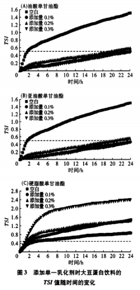 從圖3(A)和(B)可以看出,添加油酸單甘油酯和亞油酸單甘油酯的大豆蛋白飲料的TSI值較空白樣品有顯著降低,且在24h測試時間內(nèi)大部分TSI值小于0.5,說明分散體系的穩(wěn)定性良好,不穩(wěn)定現(xiàn)象不明顯。而圖3(C)中,當(dāng)硬脂酸單甘油酯添加量為0.1%時TSI值較空白樣品小,但是當(dāng)添加量為0.2%和0.3%時,大豆蛋白飲料的TSI值相對于空白樣品來說更大,該結(jié)果與圖2(C)中樣品頂部的背散射光變化的趨勢一致。