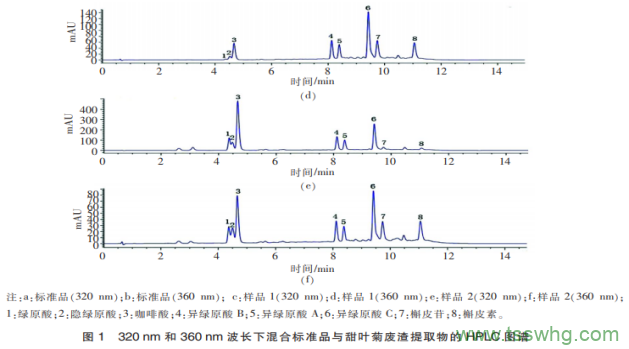 按照甜葉菊廢渣提取物的主要成分為咖啡酸、綠原酸、隱綠原酸、異綠原酸A、異綠原酸B、異綠原酸C、槲皮素和槲皮苷。采用HPLC法對兩種甜葉菊廢渣提取物中的主要成分進行定量分析。高效液相色譜條件為:AgilentEclipsePlusC18色譜柱(50mm×2.1mm,1.8μm),流動相為0.1%甲酸(A)和甲醇(B),流速0.1mL/min。洗脫程序:0~10min,10%~50%(B);10~12min,50%~10%(B);12~15min,10%(B)。檢測波長320nm和360nm,柱溫30℃,進樣量1μL。采用咖啡酸、綠原酸、隱綠原酸、異綠原酸A、異綠原酸B、異綠原酸C、槲皮素和槲皮苷為標準品,按上述色譜條件分別測定。以標準品的質(zhì)量濃度為橫坐標,峰面積為縱坐標,繪制HPLC標準曲線,并測定兩種甜葉菊廢渣提取物中各主要成分的含量,通過與標準品出峰時間相比較,從甜葉菊廢渣提取物中分離并檢測到了6種酚酸(320nm)和2種黃酮(360nm),如圖1所示。采用外標法對上述8種主要成分含量進行測定,結果見表2。樣品1中總酚酸的含量為(472.01±2.28)mg/g,總黃酮的含量為(75.27±1.37)mg/g,其中含量最高的3種成分依次為異綠原酸C(158.91±1.00)mg/g、異綠原酸B(116.39±0.57)mg/g和咖啡酸(105.67±0.37)mg/g。樣品2中總酚酸的含量為(424.41±5.01)mg/g,總黃酮的含量為(46.4±2.36)mg/g,其中含量最高的3種成分依次為咖啡酸(146.47±1.68)mg/g、異綠原酸C(88.73±1.05)mg/g和異綠原酸B(67.38±0.82)mg/g。從結果中看出,兩種甜葉菊廢渣提取物都富含酚酸和黃酮類化合物,其中,樣品1中酚酸和黃酮類化合物的總量均大于樣品2,且兩種樣品各組成成分含量之間也存在差異,樣品1綠原酸類化合物含量較多,樣品2咖啡酸含量較多。這些成分具有多種生物活性,如清除自由基,抗氧化,抗炎癥,抗衰老等。因此對甜葉菊廢渣提取物進行研究,可為其進一步開發(fā)應用提供依據(jù)。