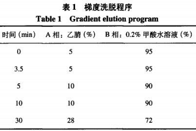 HPLC色譜條件:AgilentZORBAxSB-C18(4.6×250mm,5μm)色譜柱;流動(dòng)相:乙腈(A),0.2%甲酸水溶液(B);流速:1.2min;柱溫:25℃;進(jìn)樣量:10μL;紫外檢測(cè)波長(zhǎng):278nm;梯度洗脫,程序如表1。