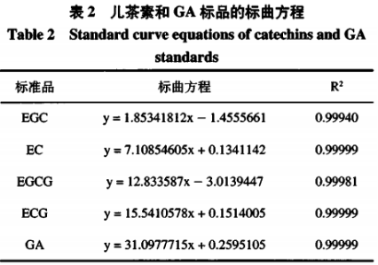 表2為兒茶素和GA標(biāo)品的標(biāo)曲方程。由決定系數(shù)R2可知方程均擬合良好。