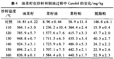 油菜籽中Canolol的變化見表4。隨著炒籽溫度的升高,菜籽油中的Canolol含量先增加后減少,在140℃時(shí)達(dá)到最大值,增加了191.4倍。油菜籽和菜籽粕中的Canolol含量也是先增加后減少,分別在130℃和140℃達(dá)到最大值,分別比對(duì)照增加了55.4倍和7.3倍。菜籽油中Canolol含量隨溫度升高而增加是由于其較強(qiáng)的脂溶性以及壓榨出油率增加,而溫度繼續(xù)升高會(huì)使Canolol含量降低,則是因?yàn)镃anolol具有熱不穩(wěn)定性,溫度過高使得Canolol熱分解。
