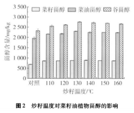 炒籽溫度對(duì)菜籽油植物甾醇的影響如圖2所示。隨著炒籽溫度的升高,菜籽油中的菜籽甾醇、菜油甾醇和谷甾醇含量均有所增加,分別在140、130、130℃最高增加了29.2%、17.7%、18.7%。
