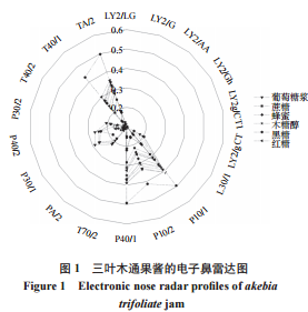根據(jù)感官、色澤、質(zhì)構(gòu)、粗蛋白、氨基酸和風(fēng)味分析,發(fā)現(xiàn)利用不同糖制作的三葉木通果醬品質(zhì)存在一定的差異,黑糖和紅糖的感官接受度較高,粗蛋白含量也顯著高于其他,另外,黑糖的質(zhì)構(gòu)特性也優(yōu)于其他。在氨基酸上,蜂蜜的種類最豐富,含有8種人體必需氨基酸,紅糖的氨基酸含量最高。在風(fēng)味物質(zhì)上,黑糖的風(fēng)味物質(zhì)種類最豐富,其中糠醛和壬醛含量相對較高,木糖醇的風(fēng)味物質(zhì)量最大,以正己醛為主。通過電子鼻分析發(fā)現(xiàn),三葉木通果醬整體響應(yīng)值較低,其中黑糖的相對較高,LDA分析表明蔗糖、紅糖和黑糖的三葉木通果醬風(fēng)味接近。