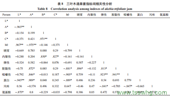 對果醬的13個指標(biāo)進(jìn)行相關(guān)性分析,相關(guān)系數(shù)矩陣見表8。大部分指標(biāo)之間存在顯著相關(guān)性,比如亮度L*與A*、粗蛋白含量和氨基酸含量呈極顯著負(fù)相關(guān)(p<0.01),A*與膠黏性、咀嚼性和粗蛋白含量呈顯著正相關(guān)(p<0.05),彈性與咀嚼性呈極顯著正相關(guān)(p<0.01)等。絕大部分指標(biāo)之間的相關(guān)系數(shù)絕對值都大于0.5,表明指標(biāo)之間相關(guān)性都較強(qiáng),可以通過主成分分析對不同糖的三葉木通果醬品質(zhì)進(jìn)行評價。