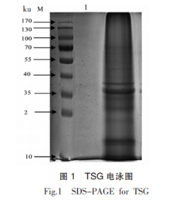 采用SDS-PAGE電泳法,以蛋白質(zhì)標(biāo)準(zhǔn)品為對(duì)照組,對(duì)TSG的分子質(zhì)量進(jìn)行測(cè)定,結(jié)果如圖1所示。圖中最左側(cè)條帶為蛋白質(zhì)標(biāo)準(zhǔn)品,條帶1為上樣質(zhì)量濃度8mg/mL的TSG。由圖可知,TSG主要由11個(gè)亞基條帶組成,分布在10~70ku,屬于低分子質(zhì)量蛋白,其中最主要亞基分布在35.34ku及13.83ku兩處,其表達(dá)量顯著高于其它分子質(zhì)量的條帶。蛋白質(zhì)的亞基組成及大小能夠影響蛋白質(zhì)的功能性質(zhì)。種子球蛋白普遍包含堿性亞基及酸性亞基,分子質(zhì)量分別在20~27ku及30~39ku內(nèi),其中酸性亞基有利于蛋白溶解性的提高,這主要是由于酸性亞基的結(jié)構(gòu)疏松,有利于促進(jìn)蛋白質(zhì)分子的伸展及親水基團(tuán)的暴露,從而提高蛋白質(zhì)的溶解性。而堿性亞基則有利于蛋白持油性的提高,降低蛋白的起泡能力,這可能與堿性亞基的疏水基團(tuán)較多有關(guān)。蛋白亞基的大小及酸性亞基和堿性亞基的比例對(duì)蛋白溶解性、起泡性、乳化性等功能特性造成一定的影響進(jìn)而影響其在食品工業(yè)中的生產(chǎn)應(yīng)用,如:蛋白質(zhì)亞基組成及大小的不同會(huì)導(dǎo)致蛋白質(zhì)局部厚度不同,致使網(wǎng)狀結(jié)構(gòu)密度形成差異,蛋白大分子亞基含量的減少,有利于蛋白溶解性、乳化性、乳化穩(wěn)定性的提高,進(jìn)而影響產(chǎn)品營養(yǎng)及加工品質(zhì)。因此,了解蛋白的亞基組成、大小及亞基與蛋白功能特性的關(guān)系可為蛋白的開發(fā)應(yīng)用提供科學(xué)指導(dǎo)。