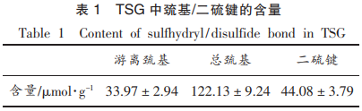 采用DTNB比色法,探究中性條件下TSG中總巰基、游離巰基及二硫鍵含量,結(jié)果如表1所示。