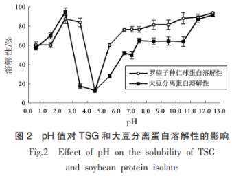 參照Garcia等的方法對(duì)蛋白溶解性進(jìn)行測(cè)定,將TSG和大豆分離蛋白溶于去離子水中配置成50mg/mL溶液,用2mol/L的HCl和NaOH溶液調(diào)節(jié)溶液pH值,于室溫下攪拌30min后以4000r/min離心30min,取上清液于280nm波長下測(cè)定紫外分光光度值。
