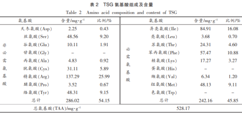 采用PITC柱前衍生氨基酸分析法對(duì)TSG的氨基酸組成及含量進(jìn)行分析,結(jié)果如表2所示。由表可知TSG氨基酸種類組成較齊全,總氨基酸含量為528.17mg/g,其中必需氨基酸含量占總氨基酸含量(E/T)的45.85%,必需氨基酸/非必需氨基酸(E/N)比值為0.85,均顯著高于FAO/WHO理想蛋白質(zhì)標(biāo)準(zhǔn)中人體必需氨基酸含量/氨基酸總含量(40%)及人體必需氨基酸含量/非必需氨基酸(0.6)標(biāo)準(zhǔn)值。在8種必需氨基酸中,異亮氨酸、苯丙氨酸、組氨酸及蘇氨酸含量最為豐富,其中異亮氨酸、苯丙氨酸、蘇氨酸均高于FAO中推薦值(異亮氨酸含量4.0%,苯丙氨酸含量6.0%、蘇氨酸含量4.0%)。但TSG中缺少含硫氨基酸——蛋氨酸,推測(cè)可能是由于酸水解作用導(dǎo)致氨基酸損失所致。此外田琨等研究表明豆科植物中缺乏蛋氨酸,因此蛋氨酸的缺少也可能與TSG提取原料有關(guān)。含硫氨基酸中除蛋氨酸外還包括半胱氨酸和胱氨酸,是蛋白質(zhì)中巰基和二硫鍵的主要來源,二者可通過氧化還原而互變。TSG中胱氨酸的含量約占總氨基酸含量的5.89%,而青稞蛋白和大豆分離蛋白中僅為1.51%,1.30%,胱氨酸含量的高低直接影響巰基及二硫鍵的含量,因而致使TSG巰基和二硫鍵含量較高。
