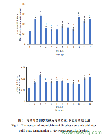 由圖 3 可見,青蒿葉渣經(jīng)過固態(tài)發(fā)酵,雙氫青蒿酸和青蒿乙素含量顯著提高,整體呈上升趨勢。數(shù)據(jù)顯示,青蒿葉渣經(jīng)地衣芽孢桿菌發(fā)酵后與對照組比較,雙氫青蒿酸和青蒿乙素含量分別提高了 111. 74%(P<0. 05)和 71. 15%(P<0. 05);其次是瑞士乳桿菌,發(fā)酵后其雙氫青蒿酸含量提高了 101. 93%(P<0. 05);青蒿葉渣經(jīng)丁酸梭 菌 發(fā)酵后,其青蒿乙素含量提高了82. 67%(P<0. 05)。