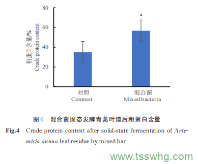 根據(jù)上述單一菌種固態(tài)發(fā)酵青蒿葉渣后粗蛋白、雙氫青蒿酸、青蒿乙素含量變化結(jié)果,選擇酵母菌、植物乳桿菌及枯草芽孢桿菌組成混合菌,發(fā)酵青蒿葉渣。如圖 4、圖 5 所示,青蒿葉渣經(jīng)混合菌固態(tài)發(fā)酵后,粗蛋白含量提高了61. 73%(P<0. 05),雙氫青蒿酸含量提高了82. 76%(P<0. 05),青蒿乙素含量提高了69. 15%(P<0. 05)?;旌暇虘B(tài)發(fā)酵青蒿葉渣功效成分含量提升顯著,為探索青蒿葉渣作為動物飼料添加劑的開發(fā)產(chǎn)提供理論指導(dǎo)。