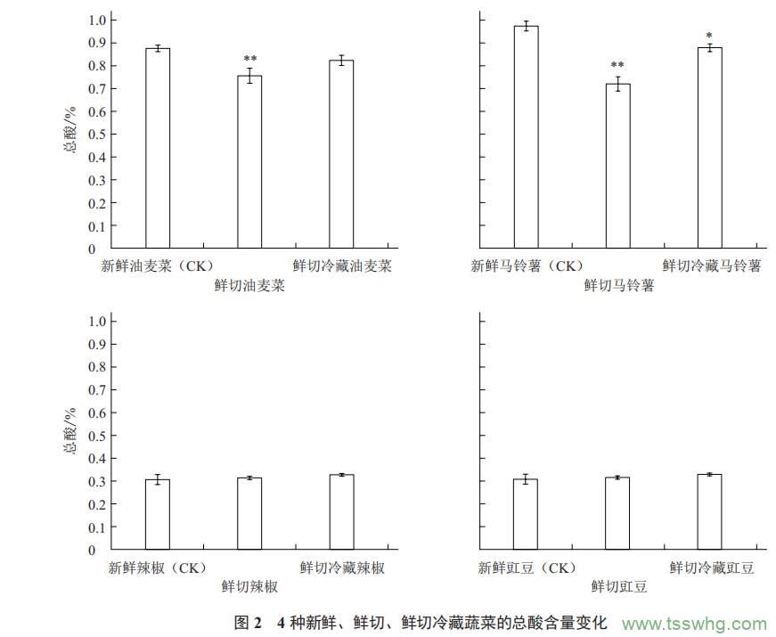 由圖2可知,鮮切和鮮切冷藏油麥菜總酸含量在0.76%~0.82%之間,馬鈴薯總酸含量在0.72%~0.87%之間,辣椒和豇豆總酸含量在0.3%左右。和新鮮蔬菜相比,鮮切油麥菜總酸含量極顯著下降,馬鈴薯鮮切后和鮮切冷藏后總酸含量也顯著或極顯著下降,辣椒和豇豆鮮切及鮮切冷藏后總酸含量無(wú)顯著變化。