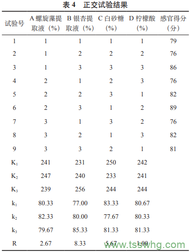 從表4可知,R2>R3>R1>R4,即各因素對螺旋藻銀杏運(yùn)動(dòng)飲料的感官評價(jià)影響順序?yàn)椋恒y杏提取液用量>白砂糖用量>螺旋藻提取液用量>檸檬酸用量,通過極差分析可知,該飲料的基礎(chǔ)配方最佳參數(shù)為A2B3C1D3。在螺旋藻提取液1%,銀杏提取液4%,白砂糖2%,檸檬酸0.4%的基礎(chǔ)配方下,制得的運(yùn)動(dòng)飲料感官評分為91分,此時(shí)溶液呈淺黃綠色,螺旋藻與銀杏氣味協(xié)調(diào),有清香味,酸甜可口、適宜。