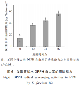 大豆異黃酮具有很強(qiáng)的抗氧化活性,經(jīng)過(guò)乳酸菌的發(fā)酵作用,糖苷型大豆異黃酮轉(zhuǎn)化為苷元型大豆異黃酮,抗氧化活性會(huì)進(jìn)一步增強(qiáng)。圖6為發(fā)酵黃漿水DPPH自由基的清除能力,由圖6可以看出,屎腸球菌R2發(fā)酵豆腐黃漿可顯著提高其清除DPPH自由基的能力,發(fā)酵36h后,黃漿水DPPH自由基的清除能力由14.20μgTrolox/mL增加到55.25μgTrolox/mL。