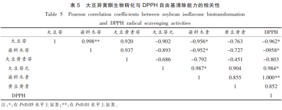 使用Pearson相關(guān)性檢驗(yàn)對(duì)大豆異黃酮轉(zhuǎn)化與DPPH自由基清除能力進(jìn)行相關(guān)性分析,結(jié)果如表5所示。結(jié)果顯示,游離型苷元大豆異黃酮大豆苷元和染料木素的含量與DPPH自由基清除能力呈顯著正相關(guān)(P<0.05),并且染料木素的含量與DPPH自由基清除能力呈極顯著正相關(guān)(P<0.01),同時(shí),糖苷型大豆異黃酮大豆苷和染料木苷的含量與DPPH自由基清除能力呈顯著負(fù)相關(guān)(P<0.05),而大豆黃素苷和黃豆黃素與DPPH自由基清除能力之間不相關(guān)(P<0.05)。說(shuō)明屎腸球菌R2發(fā)酵過(guò)程中DPPH自由基清除能力的提高確實(shí)與大豆異黃酮的生物轉(zhuǎn)化有關(guān),且主要因?yàn)槿玖夏舅睾痛蠖管赵康脑黾印?/p>