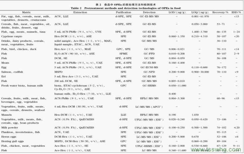OPEs樣品前處理通常由提取和凈化兩個(gè)部分組成,常見的提取、凈化方法包括加速溶劑萃取(ASE)、基質(zhì)固相分散萃取(MSPD)、MAE、超聲輔助萃取(UAE)、QuEChERS、SPE、凝膠固相萃取(GPC)、分散固相萃取(d-SPE)等方法均有應(yīng)用。表2中總結(jié)了食品基質(zhì)中OPEs的前處理方法。