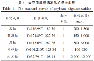 色譜柱:Aglient氨基柱(250mm×4.6mm,5μm);流動(dòng)相:70%乙腈-30%水(蔗糖、果糖、葡萄糖),68%乙腈-32%水(棉籽糖、水蘇糖);流速:1.0mL/min;進(jìn)樣量:10μL;柱溫:35℃;檢測(cè)器:示差折光檢測(cè)器。大豆低聚糖的標(biāo)準(zhǔn)曲線見表1。