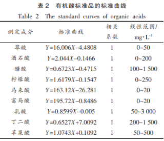 色譜柱:AgilentZORBAXSB-Aq(250mm×4.6mm,5μm);ThermoC18柱(250mm×4.6mm,5μm);流動(dòng)相:10mmol/L磷酸氫二鉀(用磷酸調(diào)pH為2.55);流速:0.5mL/min;柱溫:30℃;進(jìn)樣量:10μL。檢測(cè)器:紫外檢測(cè)器;波長:210nm。有機(jī)酸的標(biāo)準(zhǔn)曲線見表2。