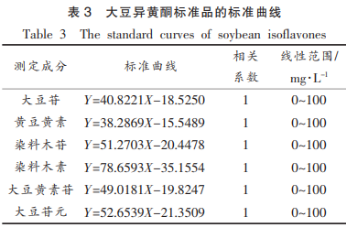 色譜柱:ThermoC18柱(250mm×4.6mm,5μm);流動(dòng)相:A:0.1%乙酸乙腈溶液,B:0.1%乙酸溶液;流速:1.0mL/min,柱溫:30℃;進(jìn)樣量:10μL。檢測(cè)器:紫外檢測(cè)器;波長:260nm。梯度洗脫條件按照GB/T26625-2011。大豆異黃酮標(biāo)準(zhǔn)曲線見表3。