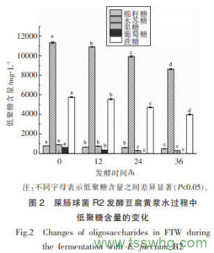 2為屎腸球菌R2發(fā)酵豆腐黃漿水過(guò)程中低聚糖含量的變化規(guī)律。新鮮豆腐黃漿水中5種糖的含量為19418.22mg/L,其中水蘇糖和蔗糖含量較高,水蘇糖含量占5種糖含量的58%,蔗糖含量占5種糖含量的30%,棉籽糖、葡萄糖和果糖的含量相對(duì)較低。在屎腸球菌R2發(fā)酵豆腐黃漿水的過(guò)程中,低聚糖含量均有不同程度的下降。發(fā)酵12h后,葡萄糖的含量迅速下降,利用率達(dá)到43%,其次為棉籽糖和果糖,利用率均為17%,水蘇糖和蔗糖的利用率較低,分別為4%和3%;發(fā)酵24h后葡萄糖基本利用完畢,無(wú)法檢出。此時(shí),果糖的利用率達(dá)到68%,棉籽糖的利用率達(dá)到22%,水蘇糖和蔗糖的利用率均為12%。表明屎腸球菌R2在發(fā)酵豆腐黃漿水時(shí)優(yōu)先利用葡萄糖,其次為果糖和棉籽糖;發(fā)酵36h后,果糖的含量幾乎沒(méi)有發(fā)生變化(P<0.05),蔗糖的利用率達(dá)到31%,棉籽糖和水蘇糖的利用率分別為38%和24%。因此,經(jīng)過(guò)屎腸球菌R2的發(fā)酵作用,可以有效地緩解棉籽糖和水蘇糖引起的胃脹氣。