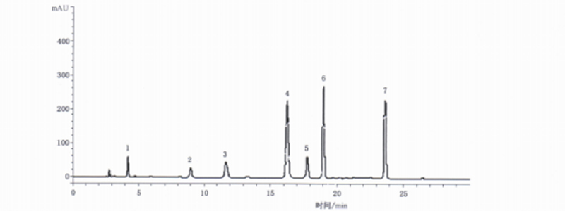 1:沒(méi)食子酸;2:表沒(méi)食子兒茶素;3:兒茶素;4:咖啡因;5:表兒茶素;6:表沒(méi)食子兒茶素沒(méi)食子酸酯;7:表兒茶素沒(méi)食子酸酯。