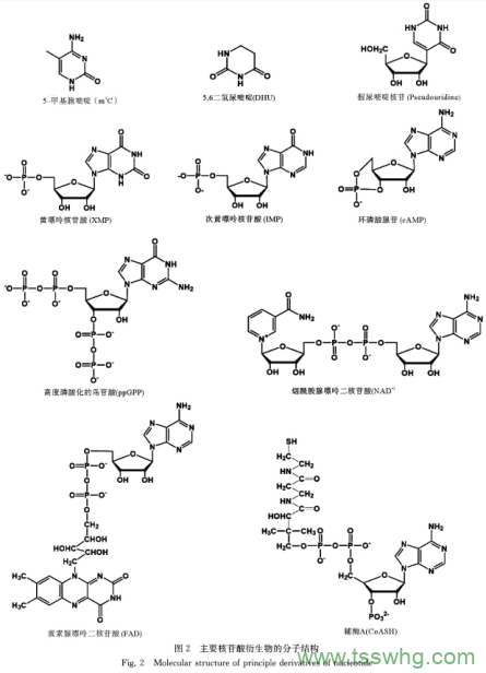 核酸一般指生物大分子的DNA(Deoxyribonucleicacid)和RNA(Ribonucleicacid),而核酸類物質(zhì)(NAS,NucleicAcidSubstance)還包括核苷酸(NT,Nucleo—tide)及其衍生物等小分子物質(zhì)。構(gòu)成DNA的單體是脫氧核糖核苷酸(dNMP),有dAMP,dGMP,dCMP和dTMP四種;而構(gòu)成RNA的單體是核糖核苷酸(NMP),除AMP、GMP、CMP和UMP四種外,生物體中還有次黃嘌呤核苷酸(肌苷酸,IMP)和黃嘌呤核苷酸(XMP)等諸多衍生物。核苷酸可以分子內(nèi)環(huán)合生成環(huán)化核苷酸(如cAMP),或附加磷酸基團生成核苷二磷酸、核苷三磷酸等。