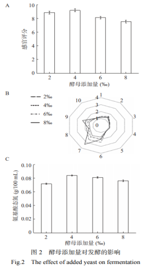 由圖2A可知,酵母添加量為4‰時(shí),感官評(píng)分最高,添加量超過4‰后,感官評(píng)分呈現(xiàn)下降趨勢(shì),可能因?yàn)榻湍笣舛鹊脑黾?,引起微生物的?jìng)爭(zhēng)性抑制,減緩了腥味物質(zhì)的分解。結(jié)合圖2B,酵母添加量為4‰的發(fā)酵液對(duì)傳感器2、7、9的響應(yīng)值均最小,說明發(fā)酵液中氮氧化物、硫化物最少。氨基酸態(tài)氮含量的變化與感官評(píng)分一致,在4‰時(shí)最高。