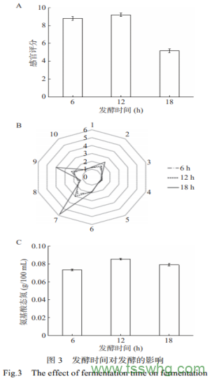 由圖3A可知,隨發(fā)酵時(shí)間延長(zhǎng),體系感官評(píng)分呈現(xiàn)先增加后降低的趨勢(shì),結(jié)合電子鼻分析(圖3B)可知,隨發(fā)酵時(shí)間延長(zhǎng),體系中氮、硫化物含量非常高,呈現(xiàn)不愉悅的氣味。由圖3C可知,發(fā)酵時(shí)間為12h時(shí),氨基酸態(tài)氮含量最高。發(fā)酵過程中蛋白質(zhì)逐漸被降解成肽、氨基酸和其他小分子,但發(fā)酵后期隨著降解的進(jìn)行,部分小分子肽、氨基酸被繼續(xù)分解成氮氧化物,從而導(dǎo)致氨基酸態(tài)氮的含量減少,感官評(píng)分降低。因此,發(fā)酵時(shí)間選擇12h作為最優(yōu)條件。