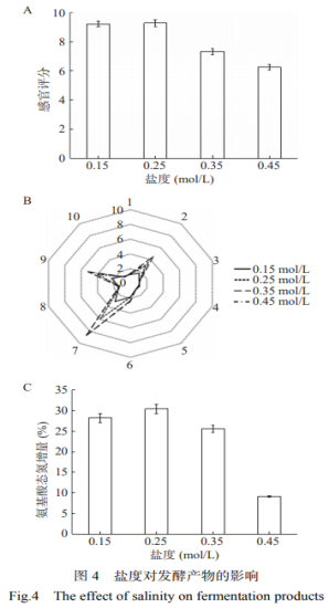 由于不同批次不同廠家的蒸煮液中含鹽量(以NaCl計(jì))存在差異,且鈉鹽的濃度會(huì)影響微生物的生長(zhǎng)代謝,進(jìn)而影響蛋白質(zhì)的降解。因此,研究蒸煮液鹽度對(duì)發(fā)酵脫腥工藝的影響十分重要。由圖4可知,鹽度為0.25mol/L時(shí),樣品的感官評(píng)分和氨基酸態(tài)氮增量最高,發(fā)酵效果最好。且在此條件下,體系對(duì)傳感器2、7、9的響應(yīng)值較小。前期實(shí)驗(yàn)結(jié)果表明當(dāng)蒸煮液鹽度為0.3mol/L和0.25mol/L時(shí),其發(fā)酵液感官評(píng)分差距較小,而蒸煮液實(shí)際鹽度為0.3mol/L,因此響應(yīng)面試驗(yàn)的鹽度以0.3mol/L為中心點(diǎn)。