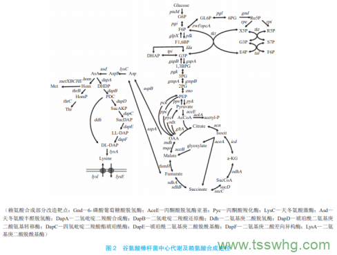 賴氨酸的主要生產(chǎn)方法有抽提法、化學(xué)合成法、酶法和發(fā)酵法。1960年日本首先以玉米為原料利用微生物發(fā)酵生產(chǎn)賴氨酸。由于微生物發(fā)酵法較其他生產(chǎn)方法有明顯優(yōu)勢,發(fā)酵法逐漸成為賴氨酸主要的生產(chǎn)方法。當(dāng)前,賴氨酸最主要的生產(chǎn)菌株有谷氨酸棒桿菌和大腸桿菌,菌種是發(fā)酵產(chǎn)業(yè)的核心,其生產(chǎn)性能是影響企業(yè)整體技術(shù)水平的關(guān)鍵因素。谷氨酸棒桿菌是最早用于工業(yè)發(fā)酵生產(chǎn)賴氨酸的菌種,早期主要利用隨機(jī)誘變育種技術(shù)。1960年日本首先利用紫外誘變技術(shù)獲得谷氨酸棒桿菌營養(yǎng)缺陷型突變體。隨著研究的深入,谷氨酸棒桿菌的中心代謝及賴氨酸合成途徑逐漸被解析(圖2)。利用分子生物學(xué)和基因工程手段,德國贏創(chuàng)德固賽、韓國希杰、日本協(xié)和發(fā)酵等公司都對產(chǎn)賴氨酸的谷氨酸棒桿菌進(jìn)行了大量全面的基因改造。
