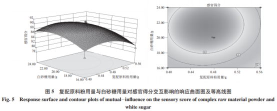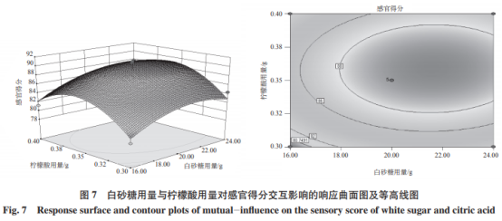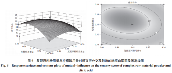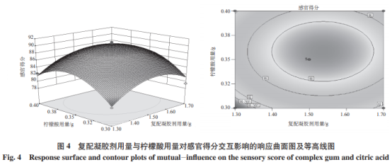 在固定復(fù)配凝膠劑和復(fù)配原料粉比例的基礎(chǔ)上,應(yīng)用Design-Expert8.0.6.1軟件對復(fù)配凝膠劑用量、復(fù)配原料粉用量、白砂糖用量、檸檬酸用量4個(gè)影響因素進(jìn)行Box-Behnken設(shè)計(jì)并分析,得到玫瑰山楂軟糖最佳配方為:復(fù)配凝膠劑(瓊脂∶卡拉膠=2∶3)用量1.53g,復(fù)配原料粉(玫瑰粉∶山楂粉=3∶2)用量0.46g,白砂糖用量21.48g,檸檬酸用量0.36g。