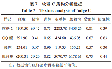 為直觀對比分析所得的質(zhì)構(gòu)特性數(shù)據(jù),除了樣品的測定以外,增加了對市售QQ糖、果凍(喜之郎)、果丹皮的質(zhì)構(gòu)特性測定,結(jié)果如表7。