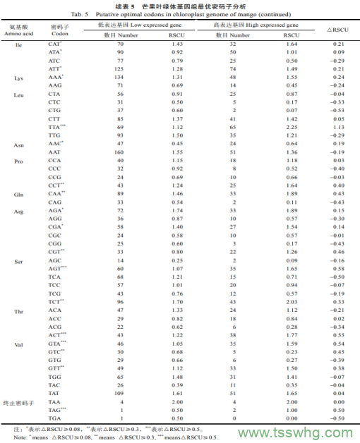 芒果葉綠體基因組,以△RSCU≥0.08為標(biāo)準(zhǔn)確定了24個(gè)高表達(dá)密碼子,以A結(jié)尾的8個(gè),以T結(jié)尾的12個(gè),以C結(jié)尾的3個(gè),以G結(jié)尾的1個(gè)。結(jié)合芒果葉綠體基因的相對(duì)同義密碼子使用度和同義密碼子相對(duì)使用度(表4和表5),確定19個(gè)最優(yōu)密碼子,分別是GCT、TGT、GAA、TTT、GGT、CAT、ATT、AAA、TTA、CCT、CAA、AGA、CGA、CGT、AGT、TCT、ACT、GTA、CTT。其中以A結(jié)尾的7個(gè),以T結(jié)尾的12個(gè),暗示芒果葉綠體基因組偏愛(ài)使用以A和T堿基結(jié)尾的密碼子。