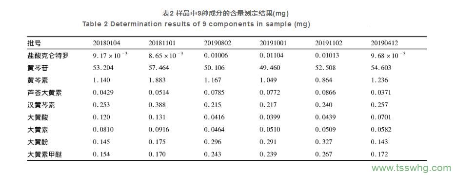 鹽酸克侖特羅、黃芩苷、黃芩素、漢黃芩素、蘆薈大黃素、大黃酸、大黃素、大黃酚和大黃素甲醚的平均加樣回收率分別為99.62%、100.02%、99.84%、97.35%、98.38%、98.92%、100.23%、99.84%、97.74%,RSD分別為1.28%、1.61%、0.78%、1.02%、2.57%、1.80%、1.53%、1.29%、2.42%。
