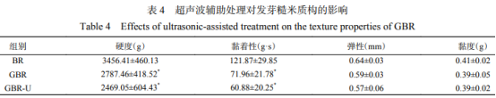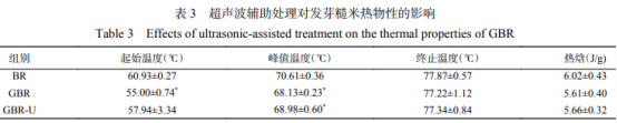 與GBR相比,超聲波輔助處理后發(fā)芽糙米糊化的起始溫度、峰值溫度、終止溫度和熱焓值分別略有升高,但兩組發(fā)芽糙米的熱物性參數(shù)無顯著差異。值得關(guān)注的是,也有研究發(fā)現(xiàn)超聲波處理(55℃,16kHz)后發(fā)芽糙米糊化所需的能量增多,這可能是因為超聲處理會誘導糙米內(nèi)的聚合物重新排列,從而使其需要更多的能量來完全糊化。這也提示本實驗所采用的超聲輔助處理條件較適宜,不影響發(fā)芽糙米的熱物性,可更有利于保持發(fā)芽后糙米的糊化特性。