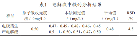 按照1.2.2鐵含量測定方法,對電極箔生產電解液中的鐵進行了測定,并根據標準工作曲線計算出鐵的含量,結果見表1。與原子吸收光度法比較,兩者結果相符。進行10次標準加入回收實驗,回收率為98.3%~103.5%。