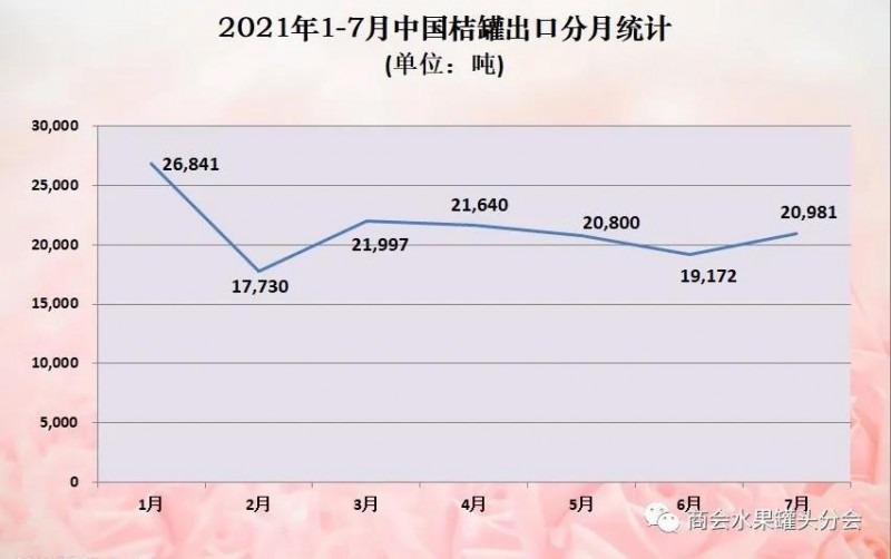 其中,2021年7月,中國桔子罐頭出口數(shù)量2.10萬噸,金額2177萬美元,平均單價(jià)1183美元/噸。與上年同期相比,數(shù)量增加2%,金額下降6%,單價(jià)減少9%。