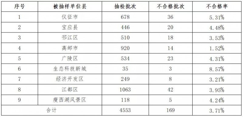 2021年上半年揚州市食用農(nóng)產(chǎn)品專項監(jiān)督抽檢計劃共抽檢4553批次,發(fā)現(xiàn)不合格樣品169批次,不合格項目179項次。