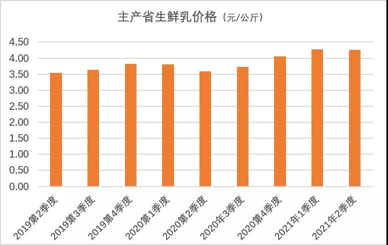 據農業(yè)農村部對全國各地500個縣農貿市場指定檢測,2021年4—6月份, 河北省、山西省、內蒙古自治區(qū)、遼寧省、黑龍江省、山東省、河南省、陜西省、甘肅、新疆省等10個主產省生鮮食品乳均價保持在1公斤4.26元上下。4月份、5月份、6月份主產省生鮮食品乳均價各自為4.26元/KG、4.24元/KG、4.27元/KG。總的看,第二季度10個主產省生鮮食品乳均價相對穩(wěn)定,同期相比增漲18.7%,環(huán)比下降0.2%。