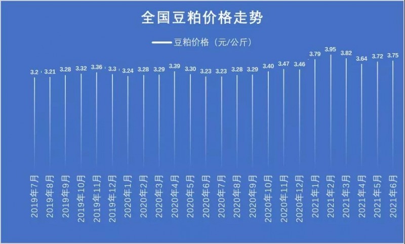 第二季度豆柏均價為3.7零元/KG,在其中,4月份全國各地豆柏均價為3.64元/KG,5月份 3.7兩元/KG,6月份3.75元/KG。4—6月份豆粕價格比2021年第一季度降低3.6%,和同期相比比增漲11.8%。