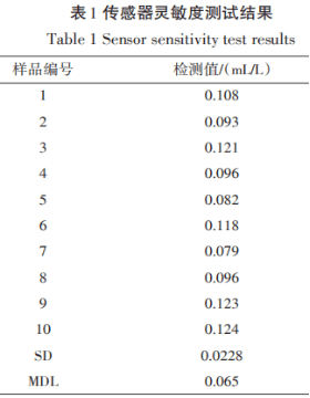 MDL=3.143δ,(δ為對同一樣版反復(fù)檢驗10次獲得的標(biāo)準(zhǔn)偏差),最終獲得文中制定的感應(yīng)器的最少檢驗幅值為0.065mL/L。這說明文中制定的感應(yīng)器擁有 優(yōu)良的敏感度。實際的研究結(jié)果以下表1所顯示: