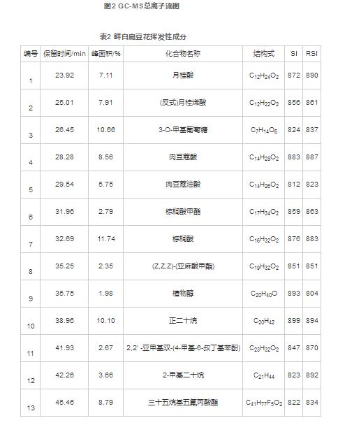該項科學(xué)研究對鮮白扁豆花開展GC-MS剖析,獲得揮發(fā)物成份的總正離子流圖(見圖2)。選用NIST規(guī)范質(zhì)譜分析庫查找融合參考文獻(xiàn),對揮發(fā)物成份開展明確辨別,依據(jù)正反面配對率≥800,共獲得13種成份,成份評定結(jié)果詳細(xì)表2。