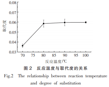 圖2是酯化反應(yīng)溫度對(duì)物質(zhì)取代度的改變圖,在其中,當(dāng)反映機(jī)制的環(huán)境溫度從70℃升到80℃時(shí),酯化反應(yīng)物質(zhì)的取代度從0.036提升至0.057后,再次上升管理體系的反映溫度,對(duì)酯化反應(yīng)的危害并不是非常大,取代度標(biāo)值轉(zhuǎn)變較小,并趨向輕緩。很有可能因?yàn)闇囟壬仙?,生物大分子鏈的活力也相?duì)提高,促進(jìn)反映系統(tǒng)中分子結(jié)構(gòu)間的有效碰撞頻次提升,取代度隨著產(chǎn)生變化。當(dāng)反映系統(tǒng)中參加化學(xué)反應(yīng)的分子結(jié)構(gòu)做到飽和狀態(tài)時(shí),有效碰撞的頻次不會(huì)再提升,取代度的轉(zhuǎn)變也保持穩(wěn)定。