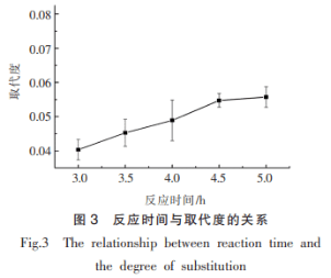 依據(jù)酯化反應(yīng)的概念剖析結(jié)果,酯化反應(yīng)會(huì)由于時(shí)間的增加慢慢做到一個(gè)規(guī)定值。如圖所示3所顯示,伴隨著酯化反應(yīng)時(shí)間的不斷增加,取代度相對(duì)應(yīng)上升,燕麥片β-聚糖的酯化反應(yīng)也越充足。酯化反應(yīng)在4.5h前,因?yàn)橄到y(tǒng)中形成的OGE濃度值較低,促使管理體系中的酯化反應(yīng)可以不斷開展。而當(dāng)全部管理體系在反映開展到5.0h時(shí),物質(zhì)的取代度增長(zhǎng)率越來(lái)越遲緩,這時(shí)反映系統(tǒng)中的酯化反應(yīng)與化合反應(yīng)將要均衡。因而,反應(yīng)速度并不可以無(wú)盡增加下來(lái)。