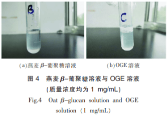 各自配置1mg/mL的燕麥片含糖量水溶液和同濃度值的OGE水溶液作比照還可以看得出,OGE水溶液更加混濁,且頂層有很多泡沫塑料存有,而燕麥片含糖量水溶液則清亮,且基本上無(wú)泡沫塑料存有。推斷是因?yàn)樵谠帑溒?beta;-聚糖中連接了聚醚,聚醚自身具有乳狀液、平穩(wěn)及潤(rùn)化功效有可能也帶到到OGE中,促使OGE液態(tài)上邊發(fā)生眾多泡沫塑料。