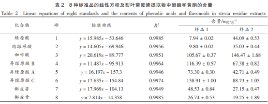 依照甜葉菊廢料提取液的主要成分為咖啡酸、綠原酸、隱綠原酸、異綠原酸A、異綠原酸B、異綠原酸C、原兒茶醛和槲皮苷。選用HPLC法對二種甜葉菊廢料提取液中的主要成分開展定性分析。高效率液相色譜儀標(biāo)準(zhǔn)為:AgilentEclipsePlusC18色譜柱(50mm×2.1mm,1.8μm),流動性相為0.1%苯甲酸(A)和工業(yè)甲醇(B),流動速度0.1mL/min。過柱程序流程:0~10min,10%~50%(B);10~12min,50%~10%(B);12~15min,10%(B)。檢驗光波長320nm和360nm,柱溫30℃,進(jìn)樣量1μL。選用咖啡酸、綠原酸、隱綠原酸、異綠原酸A、異綠原酸B、異綠原酸C、原兒茶醛和槲皮苷為標(biāo)準(zhǔn)物質(zhì),按以上色譜儀標(biāo)準(zhǔn)各自測量。以標(biāo)準(zhǔn)物質(zhì)的質(zhì)量摩爾濃度為橫坐標(biāo)軸,峰總面積為縱軸,制作HPLC標(biāo)曲,并測量二種甜葉菊廢料提取液中各主要成分的成分,根據(jù)與標(biāo)準(zhǔn)物質(zhì)出峰時間相較為,從甜葉菊廢料提取液中分離出來并檢驗到6種酚酸(320nm)和2種黃酮類(360nm),如圖所示1所顯示。選用外標(biāo)法對以上8種主要成分成分開展測量,結(jié)果見表2。試品1中總酚酸的成分為(472.01±2.28)mg/g,黃酮類物質(zhì)的成分為(75.27±1.37)mg/g,在其中占比最多的3種成份先后為異綠原酸C(158.91±1.00)mg/g、異綠原酸B(116.39±0.57)mg/g和咖啡酸(105.67±0.37)mg/g。試品2中總酚酸的成分為(424.41±5.01)mg/g,黃酮類物質(zhì)的成分為(46.4±2.36)mg/g,在其中占比最多的3種成份先后為咖啡酸(146.47±1.68)mg/g、異綠原酸C(88.73±1.05)mg/g和異綠原酸B(67.38±0.82)mg/g。從效果中看得出,二種甜葉菊廢料提取液都含有酚酸和黃酮類化合物、多糖類化學(xué)物質(zhì),在其中,試品1中酚酸和黃酮類化合物、多糖類化學(xué)物質(zhì)的總數(shù)量均超過試品2,且二種試品各構(gòu)成成份成分中間也存有差別,試品1綠原酸類物質(zhì)占比較多,試品2咖啡酸成分較多。這種成份具備各種生物活性,如降低膽固醇,抗氧化性,抗發(fā)炎,延緩衰老等。因而對甜葉菊廢料提取液開展科學(xué)研究,能為其進(jìn)一步開發(fā)設(shè)計運(yùn)用給予根據(jù)。