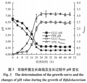 根據對雙岐桿菌生長曲線的檢測能夠看得出,FPE的加入對雙岐桿菌的成長有顯著的推動作用。雙岐桿菌在未添加FPE的GLU基本細胞培養(yǎng)液中,12h進到生長發(fā)育對數期,比較之下,在添加FPE的培養(yǎng)基中的雙岐桿菌生長遲緩期較短,不上8h時即進入了生長發(fā)育對數期,菌液的吸光度值持續(xù)提高。塑造24h后,菌液的吸光度值基本上維持在穩(wěn)定情況,雙岐桿菌的發(fā)育進到穩(wěn)定型。試驗數據顯示,雙岐桿菌在添加FPE的培養(yǎng)基中的成長速率較基本培養(yǎng)液的成長速率顯著提高,且菌液的最后吸光度值高過基本培養(yǎng)液。菌液pH的變動與吸光度值的變動呈成反比,伴隨著雙岐桿菌的提高,pH快速降低,24h后pH基本上長期保持。